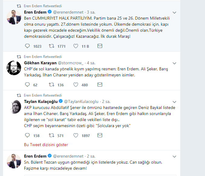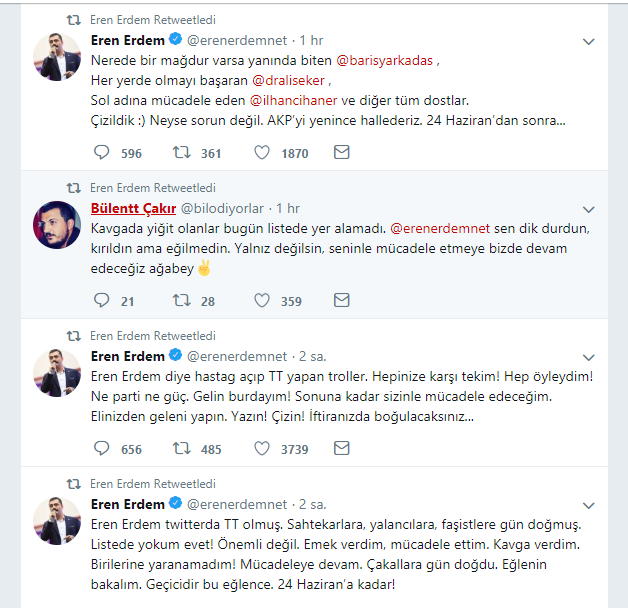 Erdem, ayrıca şu twiti attı: AKP kurucusu Abdüllatif Şener ile ömrünü hastanede geçiren Deniz Baykal listede ama İlhan Cihaner, Barış Yarkadaş, Ali Şeker, Eren Erdem gibi halkın sorunlarıyla ilgilenen ve "sol kanat" tabir edile vekilleri liste dışı..