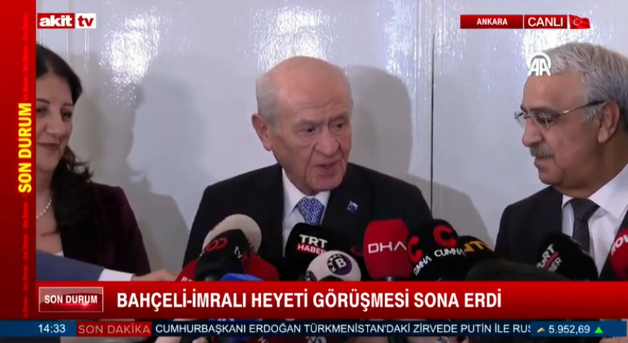 Pervin Buldan, "Bugün Sayın Bahçeli ile bir görüşme gerçekleştirdik. Teşekkür ediyoruz. Verimli bir görüşme gerçekleştirdiğimizi ifade etmek istiyoruz. Sürecin geldiği aşamaları konuştuk. Yapılması gerekenleri konuştuk. Çok önemli, kıymetli değerli bir görüşme oldu. Aşama itibarıyla yeni bir zemin üzerinde ilerlemek gerektiğini düşünüyoruz. 2. aşamaya geçtiğimizi söylemek gerekiyor. Yasal bir düzenlemeye ihtiyaç var. Elbette bir barış yasası olmalıdır. Bundan sonra komisyonun ve siyasi partilerin yapacağı çalışmalar bu düzeyde önemli olacaktır. " dedi.