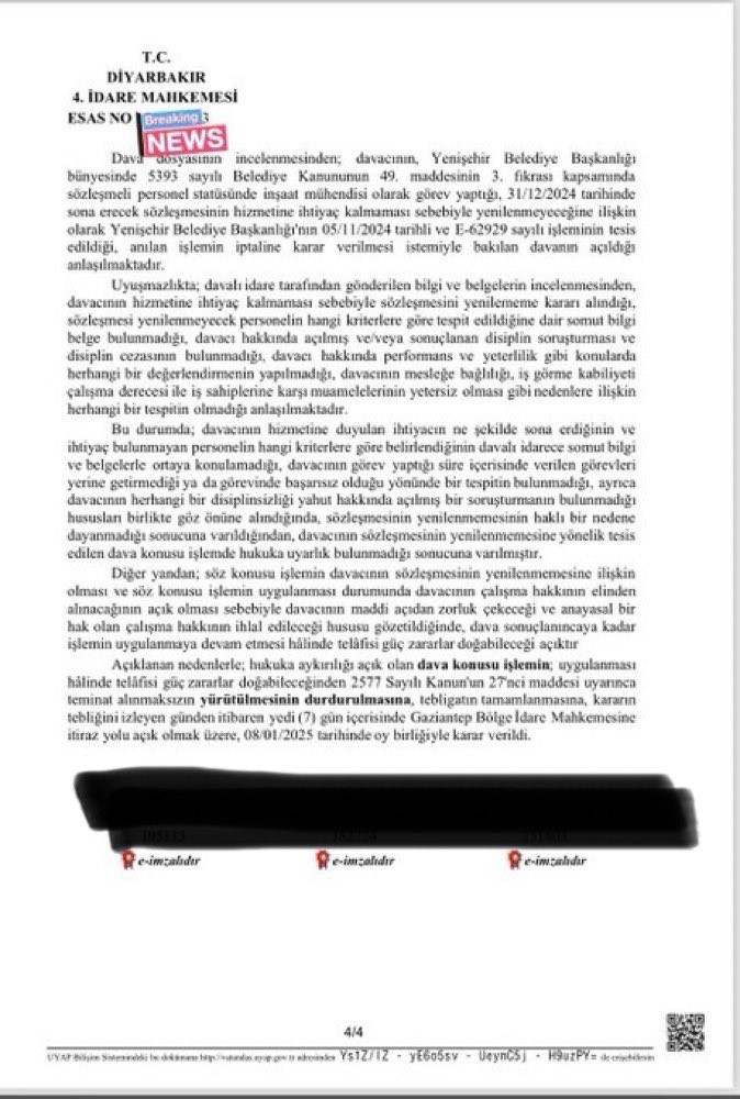 Diyarbakır İdare Mahkemesi, Yenişehir ve Kayapınar Belediyesi bünyesinde görev yapan sözleşmeli personelin sözleşmelerinin yenilenmeyeceği yönündeki kararının hukuka aykırı olduğunu ve telafisi mümkün olmayan zararlar doğuracağını belirterek yürütmenin durdurulmasına karar verdi.