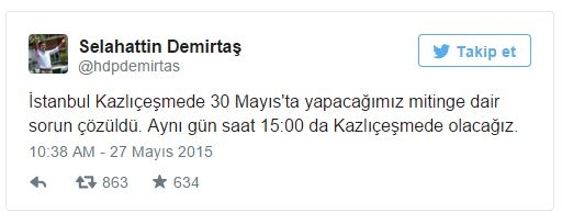 HDP Eş Genel Başkanı Selahattin Demirtaş, Twitter hesabından ''İstanbul Kazlıçeşme'de 30 Mayıs'ta yapacağımız mitinge dair sorun çözüldü. Aynı gün saat 15:00'da Kazlıçeşme'de olacağız'' diye yazdı.