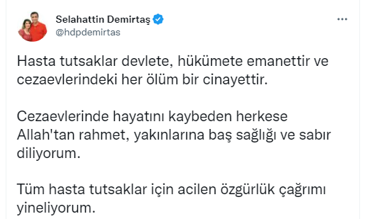 Cezaevlerinde hayatını kaybeden herkese Allah'tan rahmet, yakınlarına baş sağlığı ve sabır diliyorum.