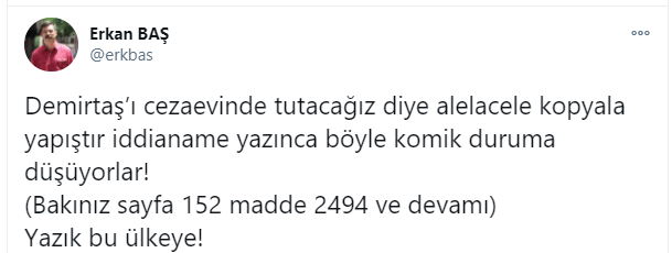 "Demirtaş’ı cezaevinde tutacağız diye alelacele kopyala yapıştır iddianame yazınca böyle komik duruma düşüyorlar! Yazık bu ülkeye."