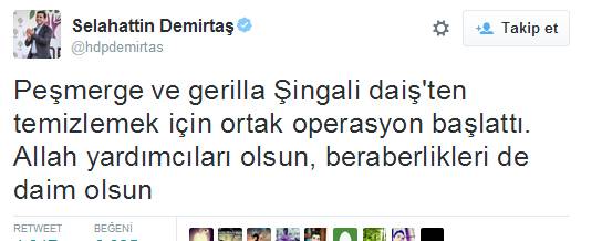 Sabah saatlerinde operasyonla ilgili açıklama yapan HDP Eş Genel Başkanı Selahattin Demirtaş da PKK'nın 'Operasyona katıldık' yalanına inanarak konuyla ilgili şu tweeti paylaştı: