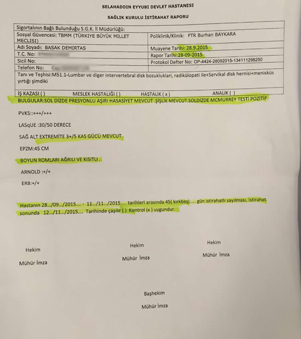 Başak Demirtaş’ın diz, boyun, mide derken son üç ayda değişik hastanelerden üst üste aldığı 774 günlük skandal sağlık raporlarına ulaşıldı
