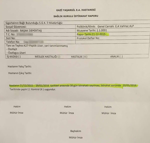 Başak Demirtaş son olarak 28.09. 2015'te Selahaddin Eyyübi Devlet Hastanesi'nden dizi için 45 gün rapor aldı. İzni bitince bu kez 21.12.2015'te Gazi Yaşargil Eğitim ve Araştırma Hastanesi'nden midesi için 30 gün rapor aldı.(star)