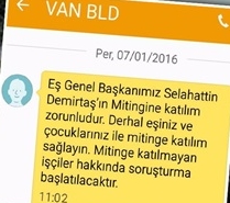 "Eş Genel Başkanımız Selahattin Demirtaş'ın mitingine katılım zorunludur" diye başlayan mesajda "Derhal eşiniz ve çocuklarınız ile mitinge katılım sağlayın. Mitinge katılmayan işçiler hakkında soruşturma başlatılacaktır" tehdit ifadeleri yer aldı.