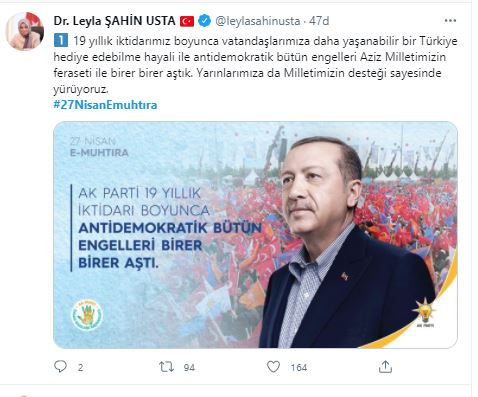 AK Parti Genel Başkan Yardımcısı İnsan Hakları Başkanı ve Konya Milletvekili Leyla Şahin Usta, “19 yıllık iktidarımız boyunca vatandaşlarımıza daha yaşanabilir bir Türkiye hediye edebilme hayali ile antidemokratik bütün engelleri Aziz Milletimizin feraseti ile birer birer aştık. Yarınlarımıza da Milletimizin desteği sayesinde yürüyoruz. Milletimizin, inancını ve inandıkları gibi yaşama isteklerini tehdit unsuru olarak gören zihniyetin oyunu olan #27NisanEmuhtırası sürecinden de Milletimizin desteği ile çıktık. Bölgemizdeki istikrar ve güvenin teminatı, dünya mazlumlarının sesi ve ümidi olduk, elhamdülillah. Demokrasi kültürümüzün üzerine gölge düşürmeye çalışanlara, ülkemizin önünü kesmek için türlü yollara girişenlere karşı biz inandığımız yolda yürüme ve liderimiz Recep Tayyip Erdoğan'ın öncülüğünde mazlumların sığınağı Türkiyemizi daha ileriye taşıma gayretimizi sürdüreceğiz” ifadelerini kullandı.
