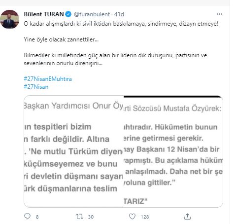 AK Parti Grup Başkanvekili, Çanakkale Milletvekili Bülent Turan, “O kadar alışmışlardı ki sivil iktidarı baskılamaya, sindirmeye, dizayn etmeye! Yine öyle olacak zannettiler... Bilmediler ki milletinden güç alan bir liderin dik duruşunu, partisinin ve sevenlerinin onurlu direnişini...” dedi.