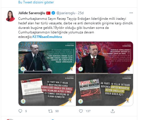 AK Parti Genel Başkan Yardımcısı, Sosyal Politikalar Başkanı, Adana Milletvekili Jülide Sarıeroğlu, “Cumhurbaşkanımız Sayın Recep Tayyip Erdoğan liderliğinde milli iradeyi hedef alan her türlü vesayete, darbe ve anti demokratik girişime karşı dimdik durarak bugüne geldik.19yıldır olduğu gibi bundan sonra da Cumhurbaşkanımızın liderliğinde yolumuza devam edeceğiz.#27NisanEmuhtıra” şeklinde konuştu.