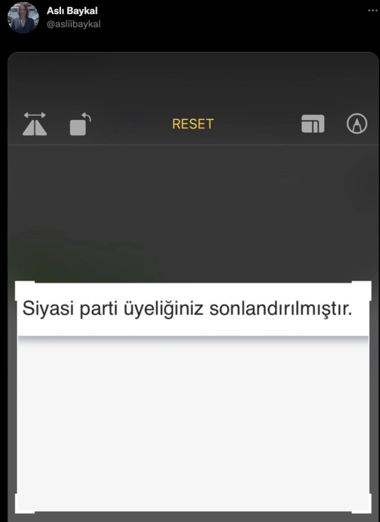 Sosyal medya hesabından 'Siyasi parti üyeliğiniz sonlandırılmıştır' yazılı mesajı paylaşan Aslı Baykal, "Neden istifa ettiniz?" sorusuna "Gördüğüm lüzum üzerine yazmanız yeterli" cevabını verdi.