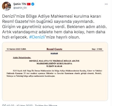 Resmi sosyal medya hesabından paylaşımda bulunan AK Parti Denizli Milletvekili Şahin Tin, “Denizli’mize Bölge Adliye Mahkemesi kurulma kararı Resmî Gazete’nin bugünkü sayısında yayımlandı. Girişim ve gayretimiz sonuç verdi. Beklenen adım atıldı. Artık vatandaşımız adalete hem daha kolay, hem daha hızlı erişecek. #Denizli’mize hayırlı olsun” ifadelerini kullandı.