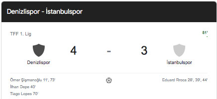 Denizlispor - İstanbulspor maçı sonucu bir hayli merak ediliyor. 1. Lig 33. haftasında İstanbulspor, deplasmanda Denizlispor’a konuk oldu. İlk yarıda her iki kaleye 5 gol atıldı. Peki Denizlispor - İstanbulspor maç sonucu ne oldu? Denizlispor - İstanbulspor maçı sonucu kaç kaç? Denizlispor - İstanbulspor maçında kim yendi?