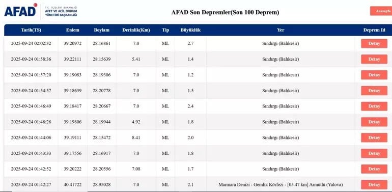 AFAD tarafından açıklanan en son depremler listesine aşağıdaki adresten ulaşabilirsiniz.