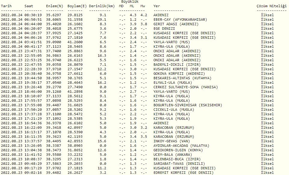 Deprem mi oldu? Son depremler 24 Ağustos Çarşamba