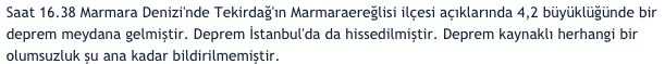 Marmara Denizi'nde deprem oldu. AFAD tarafından depremin büyüklüğü 4.2 olarak açıklandı. Depremin merkez üssünün Marmara Denizi olduğu ifade edildi. Avrupa Akdeniz Sismoloji Merkezi'nin (EMSC) İstanbul'da 4 büyüklüğünde bir deprem meydana geldi. Geçtiğimiz haftalarda Malatya Pötürge'de son deprem meydana gelmişti.