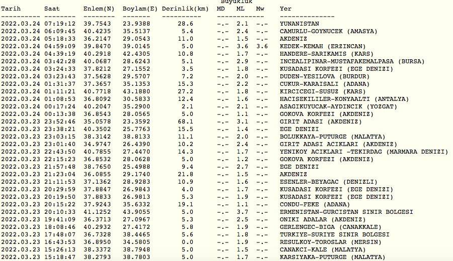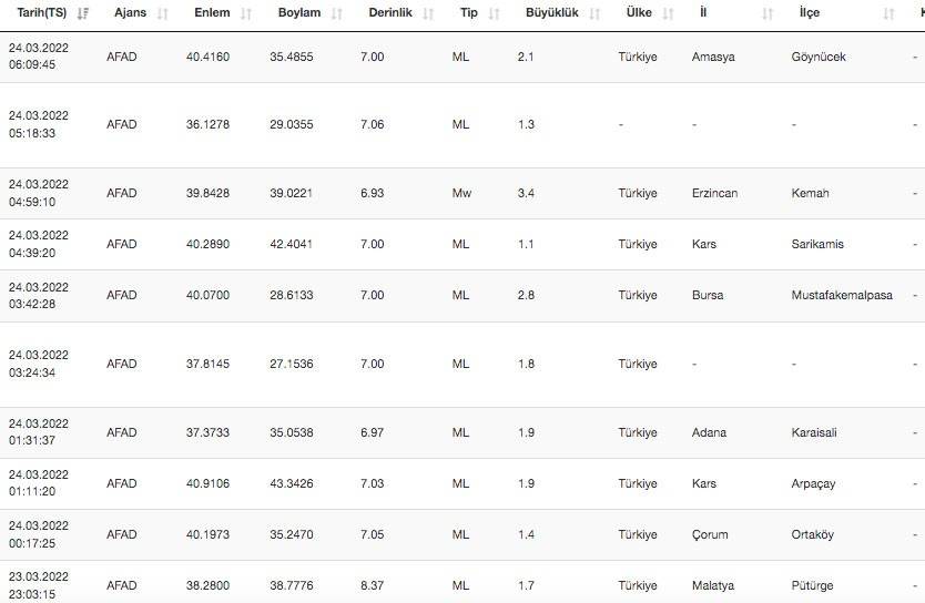 İçişleri Bakanlığı Afet ve Acil Durum Yönetimi Başkanlığının verilerine göre 24 Mart 2022 Perşembe son depremler listesi ise şu şekilde:
