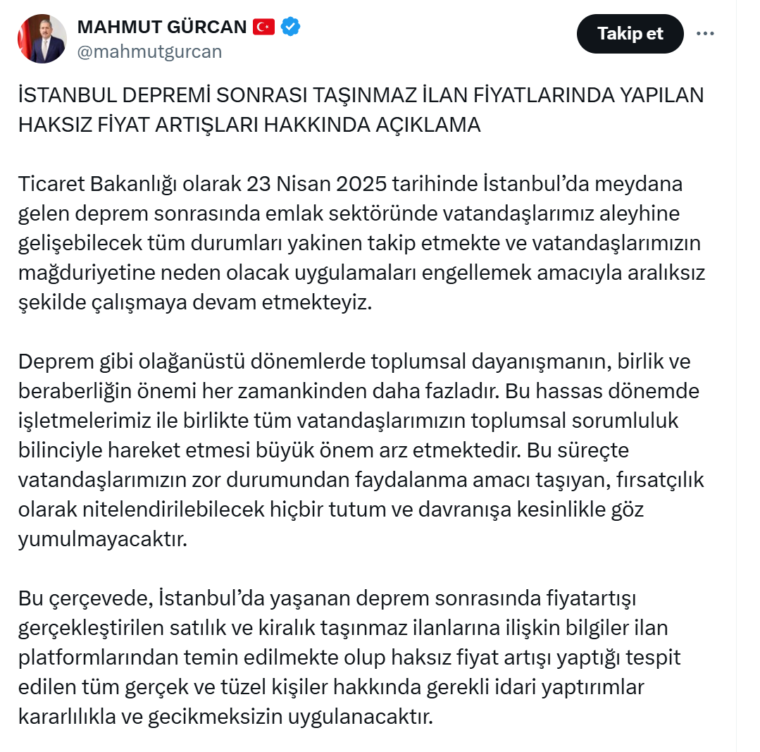 "Ticaret Bakanlığı olarak 23 Nisan 2025 tarihinde İstanbul'da meydana gelen deprem sonrasında emlak sektöründe vatandaşlarımız aleyhine gelişebilecek tüm durumları yakinen takip etmekte ve vatandaşlarımızın mağduriyetine neden olacak uygulamaları engellemek amacıyla aralıksız şekilde çalışmaya devam etmekteyiz.