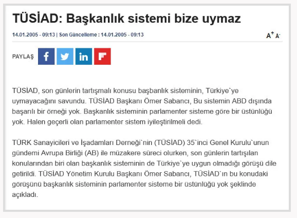 Milletin 16 Nisan 2017’de gerçekleştirilen referandumda %51,4’lük desteğiyle yürürlüğe giren Cumhurbaşkanlığı Sistemi’ne muhalif tavır takınan TÜSİAD, bu sistemin Türkiye’ye uymayacağını savundu. 2005 yılında dönemin TÜSİAD Başkanı Ömer Sabancı, “Bu sistemin ABD dışında başarılı bir örneği yok. Başkanlık sisteminin parlamenter sisteme göre bir üstünlüğü yok. Halen geçerli olan parlamenter sistem iyileştirilmeli” dedi.