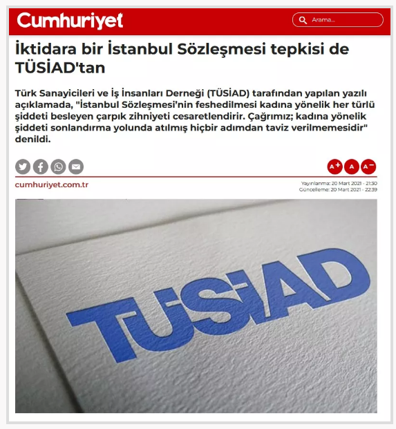 TÜSİAD, eşcinselliğin legalleştirildiği ve aile yapısını zedeleyici maddeler barındırmasıyla eleştirilen İstanbul Sözleşmesi’nden Türkiye’nin çekilmesi hususunda tavır aldı. TÜSİAD, İstanbul Sözleşmesi’nin Cumhurbaşkanı Recep Tayyip Erdoğan’ın imzasıyla fesat sözleşmenin iptal edilmesine tepki gösterdi. TÜSİAD’dan 20 Mart 2021’de yapılan açıklamada, “Türkiye’nin İstanbul Sözleşmesi’ni feshetmesi, kadına yönelik her türlü şiddeti besleyen çarpık zihniyeti cesaretlendirir. Devletin şiddete karşı sürdürdüğü mücadelesini ise kolaylaştırmadığı gibi telafisi mümkün olmayan sonuçlar doğurur” denildi.