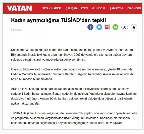 Patronlar derneği TÜSİAD, hükümet kabinesinde bakanların cinsiyet oranı hakkında bile açıklama yaptı. 29 Ağustos 2007’de kurulan 60. Hükümet’in bakanlar kurulundaki kadın-erkek sayısı hakkında konuşan dönemin TÜSİAD Başkanı Arzuhan Yalçındağ, ‘Kabinede bir tek kadın bakanın bulunmasını seçim öncesi beyanlarla bağdaşmaz bulduklarını’ söyledi.