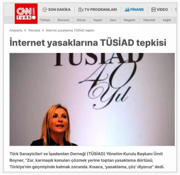 TÜSİAD, internet ortamındaki müstehcen ve yalan içerikli yayınlarla ilgili düzenlemeye ‘yasaklama’ diyerek itiraz etti. AK Parti iktidarının 2011 yılında gerçekleştirdiği çalışmayı “internet yasağı” olarak yorumlayan dönemin TÜSİAD Başkanı Ümit Boyner, şunları söyledi: “Zor, karmaşık konuları çözmek yerine toptan yasaklama dürtüsü, Türkiye’nin geçmişinde kalmak zorunda. Kısaca, ‘yasaklama, çöz’ diyoruz.”