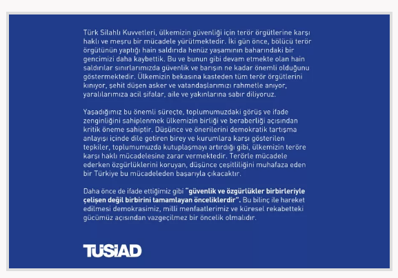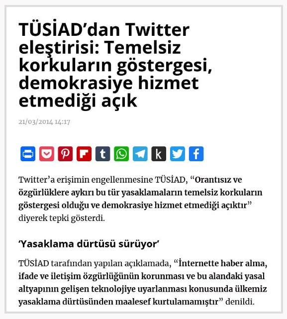 Türkiye’de ofis açmayıp, kanunlara uymamakta ısrar eden ABD şirketi Twitter’ın şikayetlerle ilgili hiçbir işlem yapmaması üzerine harekete geçen iktidarın Twitter’a geçici erişim kısıtlaması getirmesiyle ilgili ilk tepkilerden biri yine TÜSİAD’dan geldi. TÜSİAD’ın 2014 yılındaki açıklamasında şu ifadeler kullanıldı: