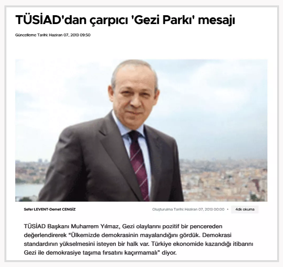 Dönemin TÜSİAD Başkanı Muharrem Yılmaz, olayların büyüdüğü 7 Haziran 2013’te, “Gezi Parkı merkezli yaşanan gelişmeler aslında vatandaşların çoğulculuk, katılımcılık taleplerinin dikkate alınma, ihmal edilmeme beklentilerinin bir yansımasıdır. Bu beklentilere ilişkin hayal kırıklığının yarattığı birikim geniş katılım bulan bu protestoları yaratmıştır. Herkesin çıkarması gereken sonuç yönetim anlayışında çoğulculuk ve katılımcılığı hâkim kılmak. /.../ Türkiye ekonomide kazandığı itibarını Gezi ile demokrasiye taşıma fırsatını kaçırmamalı” dedi.