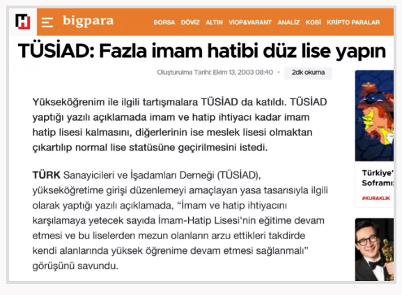 TÜSİAD, İmam Hatip okulları tartışmasını da es geçmedi. İmam hatip okullarının gerektiğinden fazla olduğunu savunan TÜSİAD ‘gereksinim fazlası imam hatip okullarının kapatılmasını’ istedi. TÜSİAD’ın 12 Ekim 2003 tarihinde yayınlanan raporunda, şu ifadeler yer aldı: