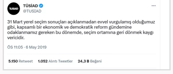 YSK kararına tepki gösteren TÜSİAD’ın sosyal medya hesabı üzerinden yaptığı tepki açıklamasında, “31 Mart yerel seçim sonuçları açıklanmadan evvel vurgulamış olduğumuz gibi, kapsamlı bir ekonomik ve demokratik reform gündemine odaklanmamız gereken bu dönemde seçim ortamına geri dönmek kaygı vericidir” denildi.