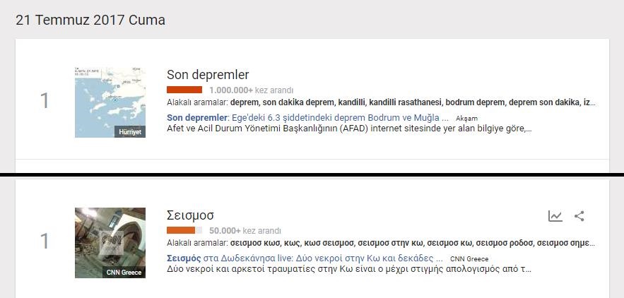 Google Trendler verilerine göre; Türkiye’de deprem konusu 1 milyonun üzerinde aratılırken, Yunanistan’da ise bu konuyla alakalı 50 binin üzerinde Google araması yapıldı.