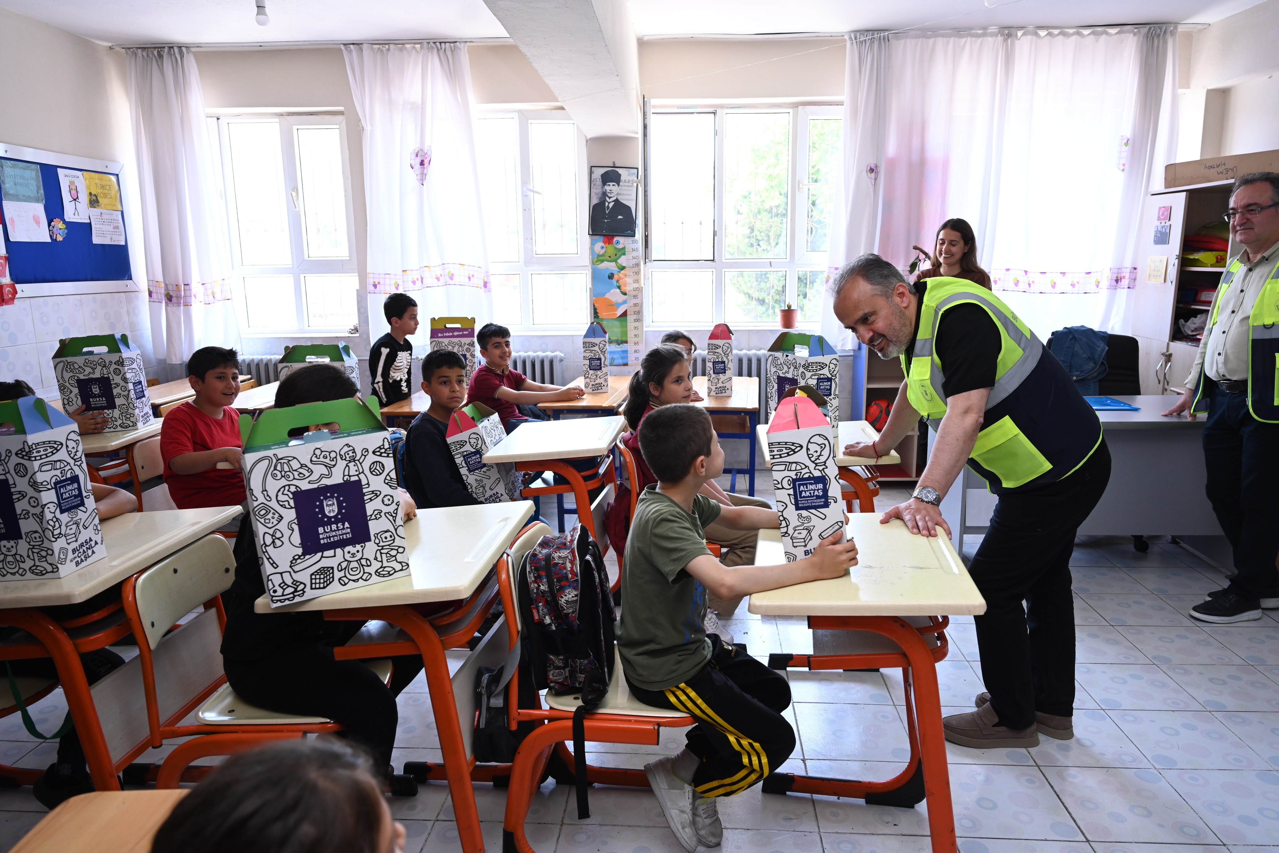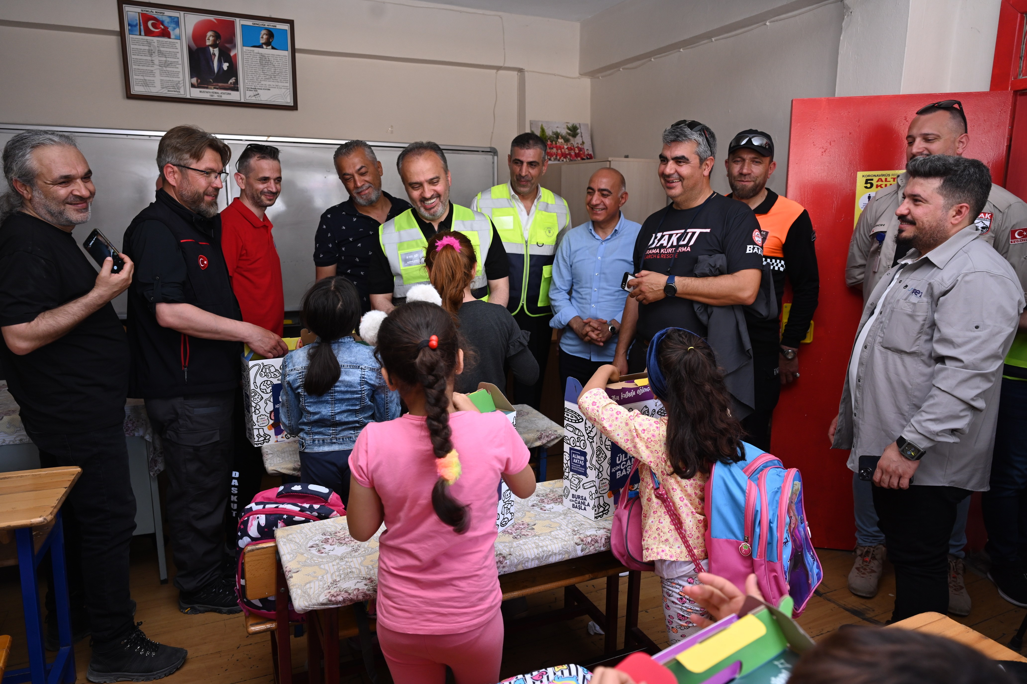 Hatay’daki programları kapsamında sık sık çocuklarla bir araya gelen Bursa Büyükşehir Belediye Başkanı Alinur Aktaş, bu kez Gazi Paşa İlkokulu öğrencilerine sürpriz yaptı. Öğrencileri okullarında ziyaret eden Başkan Aktaş, sınıfları gezdi ve küçük afetzedelere oyuncak dağıtıp, onlara moral verdi. Bölgedeki yaraları sarmak için yoğur bir mesai harcadıklarını ifade eden Başkan Aktaş, “Yaraları, acıları hep beraber sarmaya çalışıyoruz. Gazipaşa İlkokulu'nda yavrularımıza getirdiğimiz hediyelerimizi dağıttık. Çocuk her yerde çocuk, çocuk her zaman çocuk. Dolayısıyla da yavrularımızın yüzünü güldürmek için onlara hediyeler dağıttık. Oyuncaklar getirdik, boyama kitapları getirdik, boyalar getirdik, oyun aletleri getirdik ve onların yüzlerine bir nebze olsun bir gülücük katmaya çalıştık. Tabii özellikle temennimiz ve duamız odur ki inşallah en kısa zamanda yaraları saralım. Çocuklarımızdaki bu gülücüğü görmek, Hatay'da hayatın normalleştiğini görmek beni ziyadesiyle mutlu etti. Ben bu vesileyle öğretmenlerimize çok teşekkür ediyorum, yavrularımıza da başarılar diliyorum” diye konuştu.