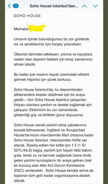 "İstanbul'da özel üyelere hizmet veren sosyal kulüp Soho House depremzedelere yardım kampanyası düzenlemiş.