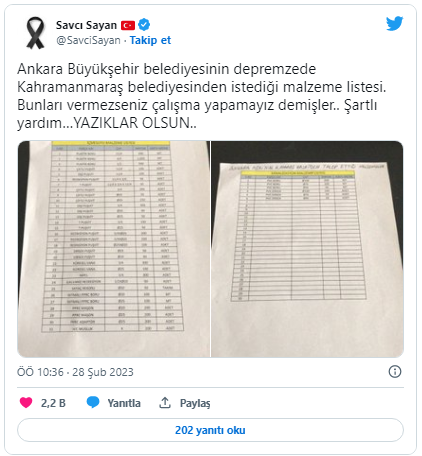 Mansur Yavaş başkanlığındaki CHP'li Ankara Büyükşehir Belediyesi Kahramanmaraş'a şartlı yardım gönderiyor. Ankara ASKİ, Kahramanmaraş KASKİ'den malzeme talep etmek için utanmadan liste hazırladı. Ankara Büyükşehir Belediyesi'nin şartlı yardımını Ağrı Büyükşehir Belediye Başkanı Savcı Sayan ortaya çıkardı. İşte, o liste...