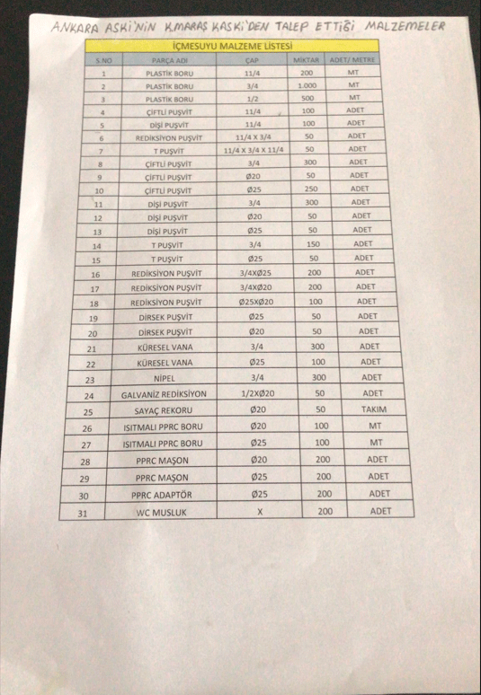 Ankara Büyükşehir Belediyesi bu malzemeleri Ankara'daki bir nalburdan bulamamış. Taş taş üstünde kalmayan Kahramanmaraş KASKİ'den malzeme talep ediyor.