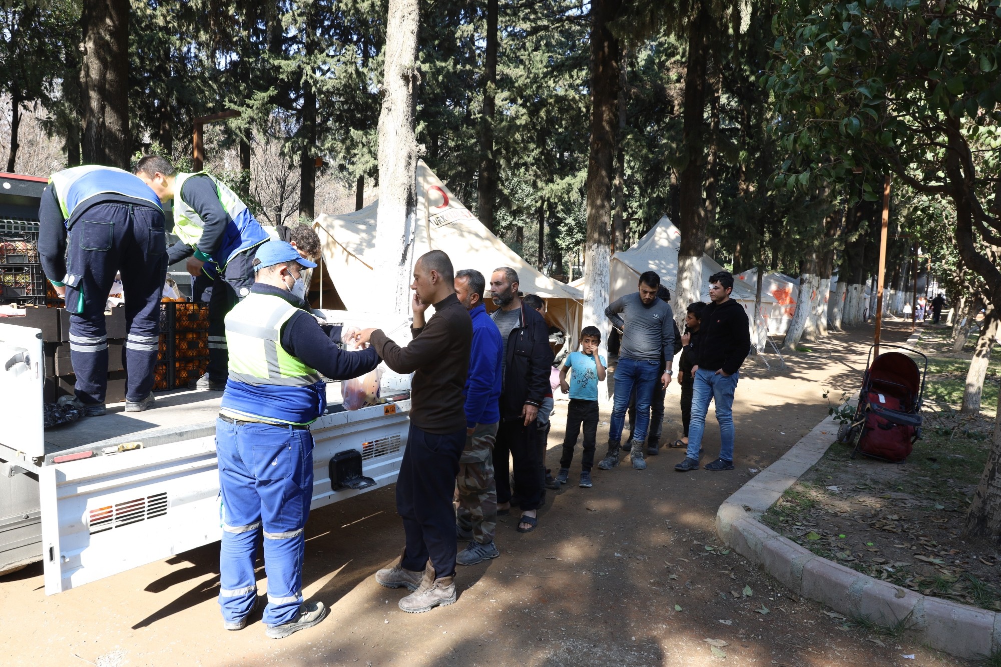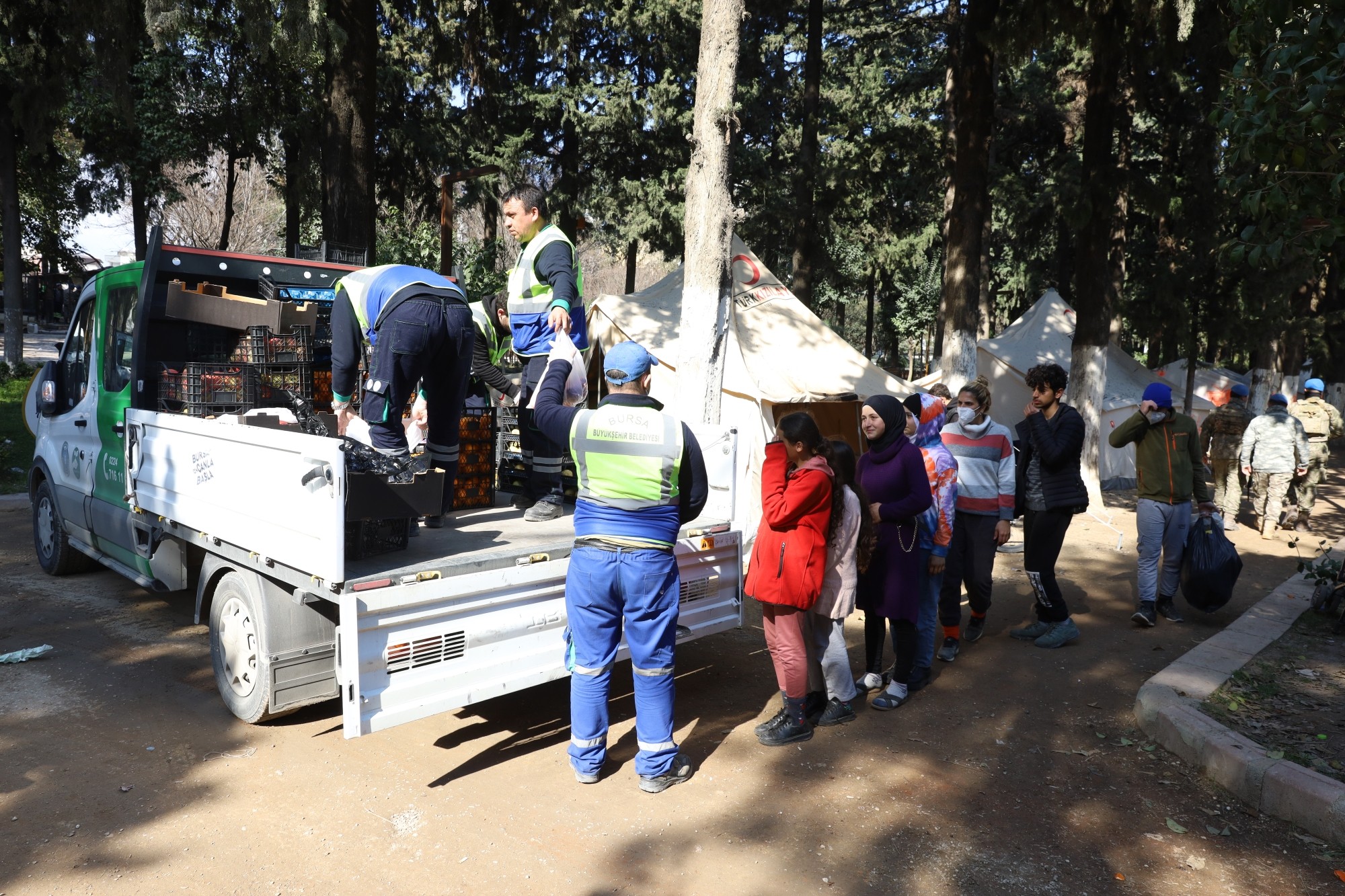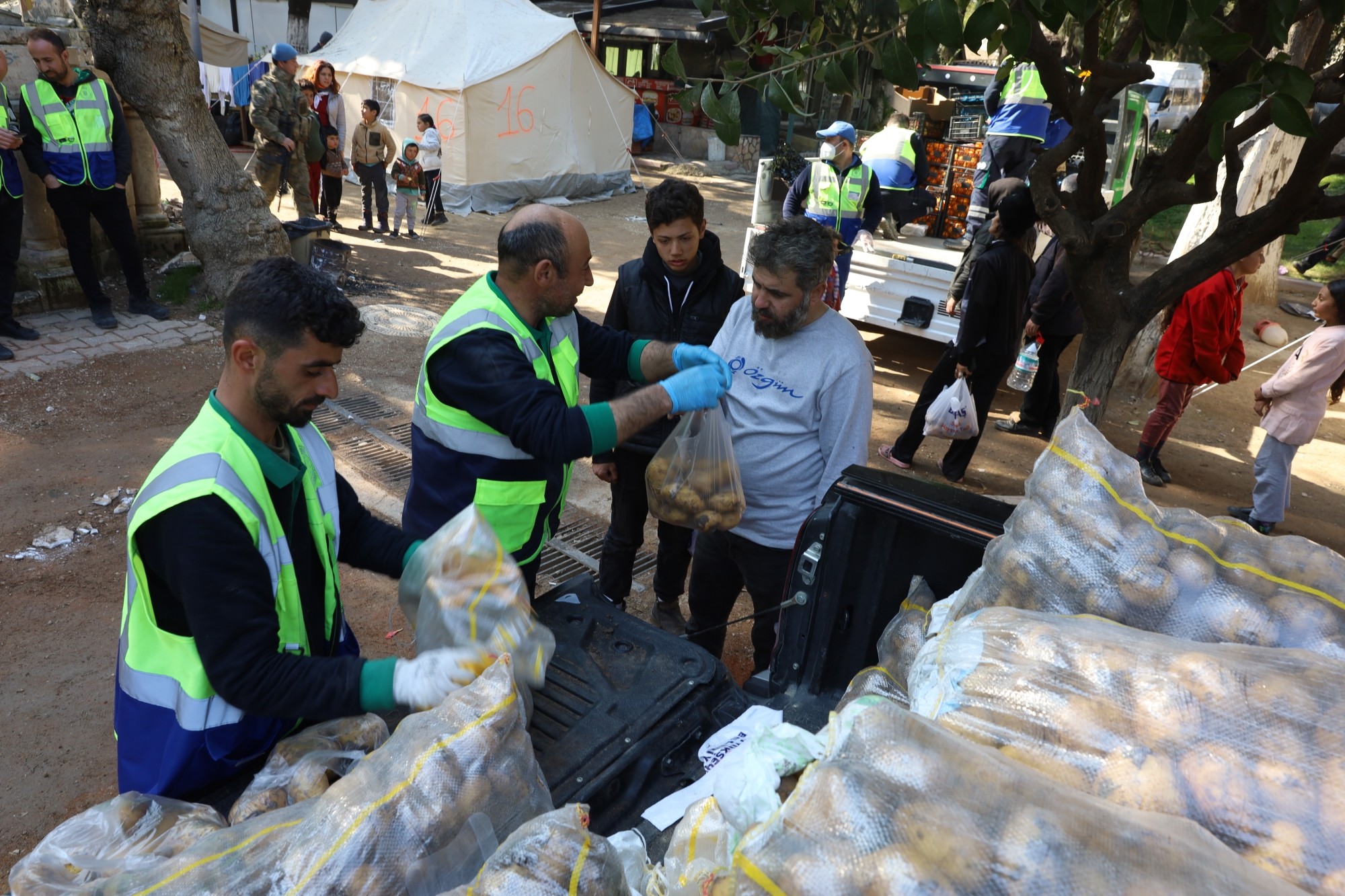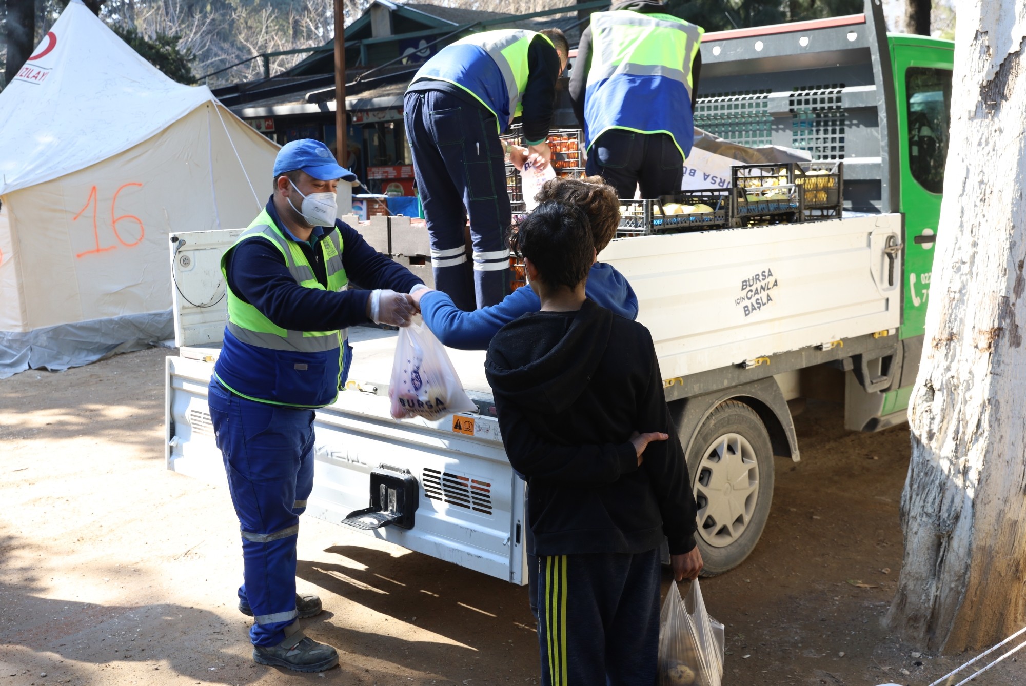 Bursa Büyükşehir Belediyesi’nin Hatay’da deprem yaralarını sarma çalışmalarına toplam 81 personelle destek veren Tarım Peyzaj A.Ş., Bursa’dan getirdiği meyve ve sebzeleri düzenli olarak afetzedelere dağıtıyor. Bugüne kadar 150 ton meyve ve sebzenin dağıtımını gerçekleştiren Tarım Peyzaj A.Ş., önceki gün gelen 18 ton patates ile kışlık meyveyi de ‘çadır kentlerin bulunduğu alanda’ ihtiyaç sahiplerine ulaştırdı.