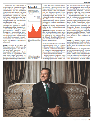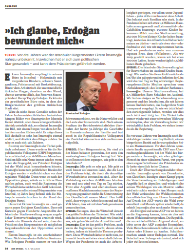 Alman Der Spiegel dergisi‘nin 29 Ocak 2022 tarihli sayısında İstanbul Büyükşehir Belediye Başkanı Ekrem İmamoğlu ile bir söyleşi yayınladı. Dergi, AB politikasında etkili ve "Atlantik köprüsü"nün yönlendirici medya organlarından birisi sayılıyor.