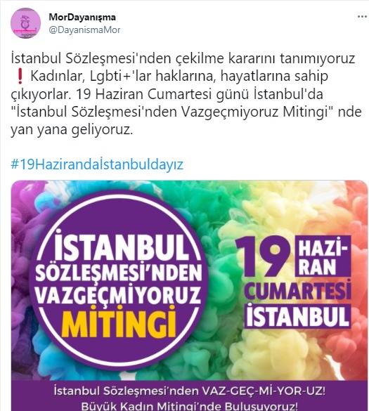 Mor Dayanışma sosyal medya hesabından yapılan açıklamada, “İstanbul Sözleşmesi'nden çekilme kararını tanımıyoruz. Kadınlar, LGBTİ+'lar haklarına, hayatlarına sahip çıkıyorlar. 19 Haziran Cumartesi günü İstanbul'da ‘İstanbul Sözleşmesi'nden Vazgeçmiyoruz Mitingi’nde yan yana geliyoruz” ifadeleri yer aldı.