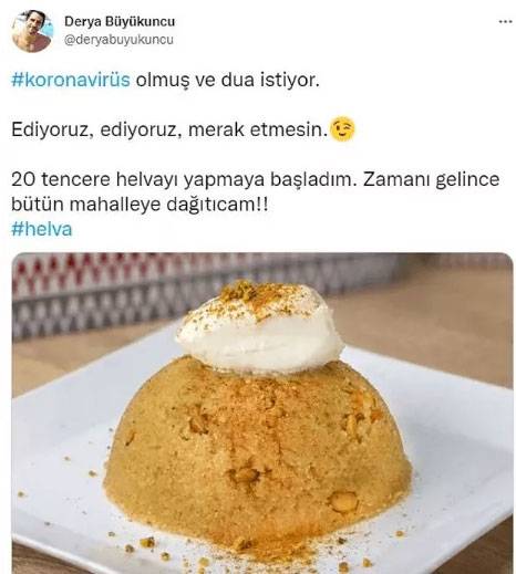 Cumhurbaşkanı Erdoğan'ın Covid-19 testinin pozitif çıkmasının duyurulmasının ardından sosyal medyada #helva etiketi altında paylaşımlar yapıldı. Bu etiketi kullanan Derya Büyükuncu'da bir paylaşımında 'Koronavirüs olmuş ve dua istiyor. Ediyoruz, ediyoruz, merak etmesin. 20 tencere helvayı yapmaya başladım. Zamanı gelince bütün mahalleye dağıtacağım' demişti. Büyükuncu, daha sonraki paylaşımında ise 'Helva dedik, ne kadar da büyük bir kitle o insan!! için üstüne alındı. Allah kimseyi başkasının önünde eğilecek, kula kulluk edecek, karşısında el pençe divan duracak kadar karaktersiz, korkak yapmasın. Amin!!!' şeklinde bir paylaşım yapmıştı.