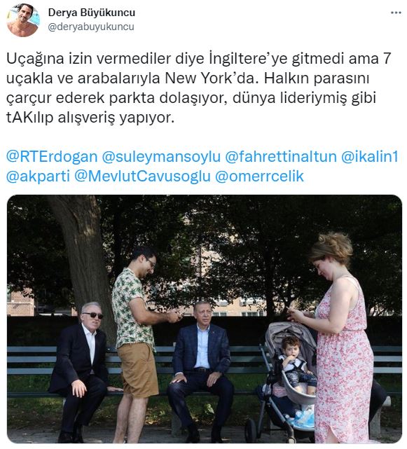 Uncu paylaşımında, “Uçağına izin vermediler diye İngiltere’ye gitmedi ama 7 uçakla ve arabalarıyla New York’da. Halkın parasını çarçur ederek parkta dolaşıyor, dünya lideriymiş gibi takılıp alışveriş yapıyor” ifadelerini kullandı.