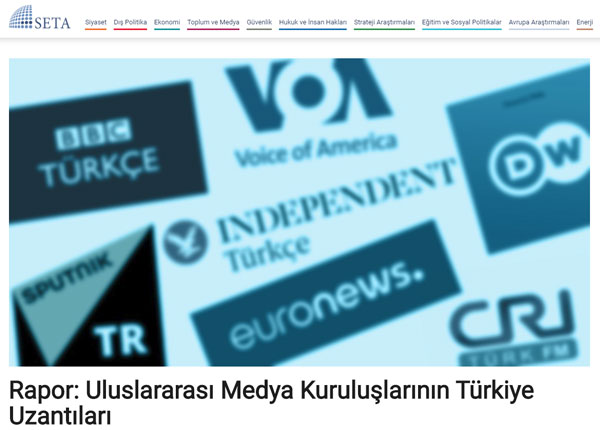 yeniakit.com.tr Ankara Merkezli SETA Vakfı’nın Türkiye’de yayın yapan casus medya organlarına dair araştırması büyük yankı uyandırdı. BBC Türkçe, Deutsche Welle Türkçe, Amerika'nın Sesi, Sputnik Türkiye, CRI Türk, Independent Türkçe ve Euronews Türkiye'yi de içeren raporda, yayın kuruluşlarının hükümete karşı tavrı gözler önüne serildi.