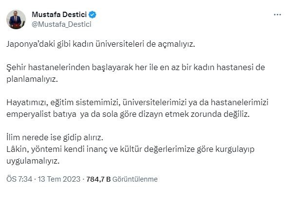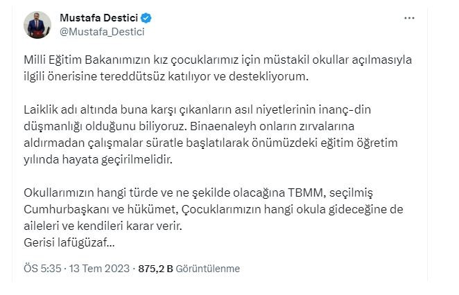 Destici, paylaşımında şu ifadelere yer verdi: "Milli Eğitim Bakanımızın kız çocuklarımız için müstakil okullar açılmasıyla ilgili önerisine tereddütsüz katılıyor ve destekliyorum. Laiklik adı altında buna karşı çıkanların asıl niyetlerinin inanç-din düşmanlığı olduğunu biliyoruz. Binaenaleyh onların zırvalarına aldırmadan çalışmalar süratle başlatılarak önümüzdeki eğitim öğretim yılında hayata geçirilmelidir.