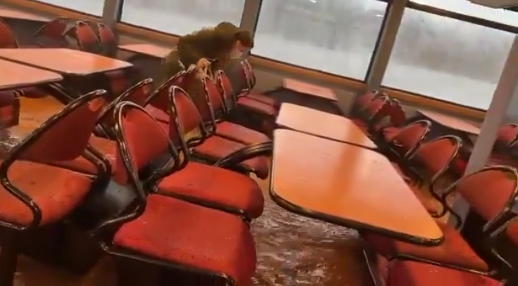 Görüntüler Almanya'nın Hamburg kentindeki bir banliyö feribotundan. Elbe Nehri'nde Hadag nakliye firması tarafından işletilen feribotun fırtınadan dolayı oluşan dev dalgalarla birlikte camları kırıldı. Feribotun penceresine büyük bir dalganın çarptığı ve suların tekneye hücum etmesiyle gemideki insanların kaçmasına neden olduğu anlar önde oturan bir yolcu tarafından kaydedilen görüntülere yansıdı. Yaşanan olayda yaralı olup olmadığına dair bir bilgi paylaşılmadı.