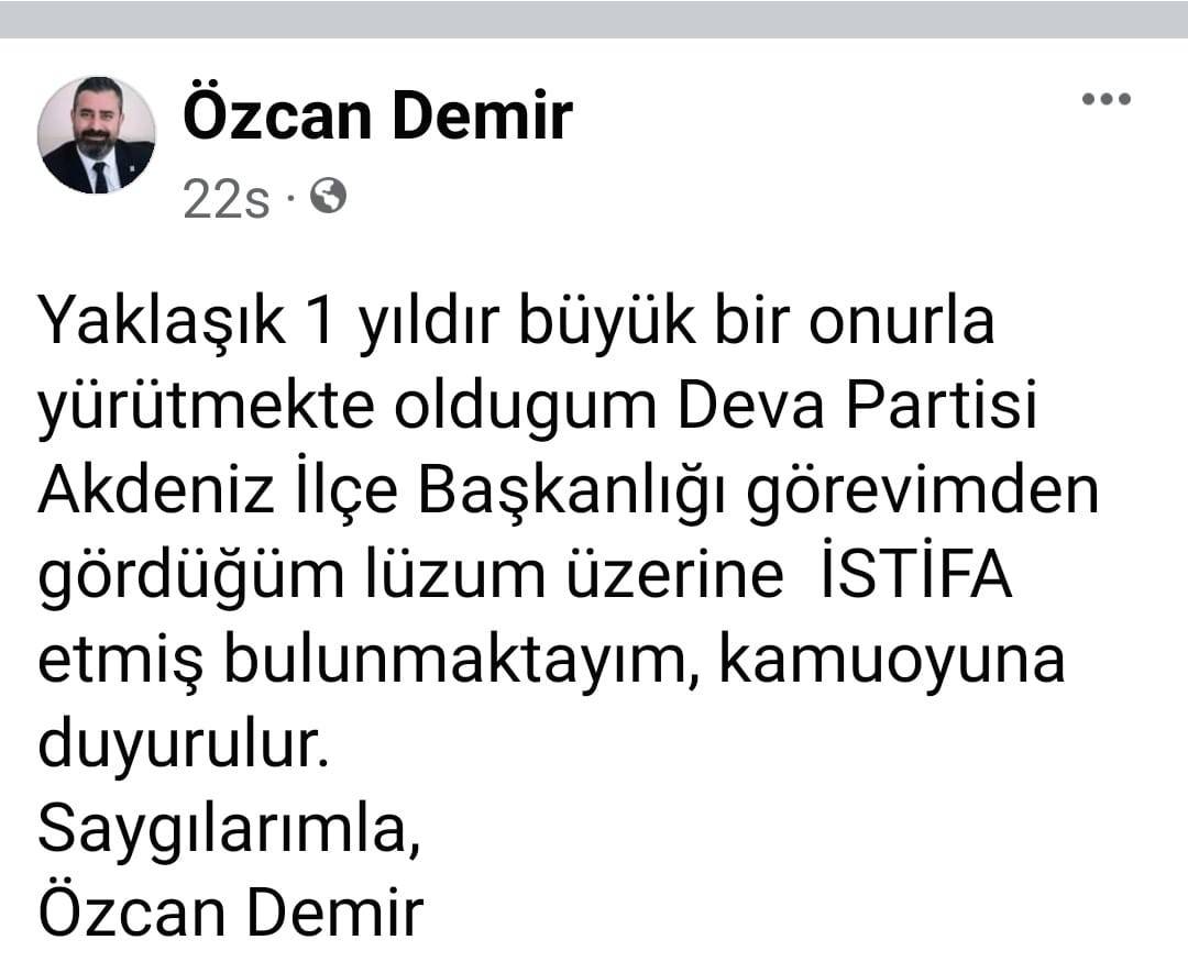 Yaklaşık 1 yıldır büyük bir onurla yürütmekte olduğum DEVA Partisi Akdeniz İlçe Başkanlığı görevimden gördüğüm lüzum üzerine istifa etmiş bulunmaktayım, kamuoyuna duyurulur.