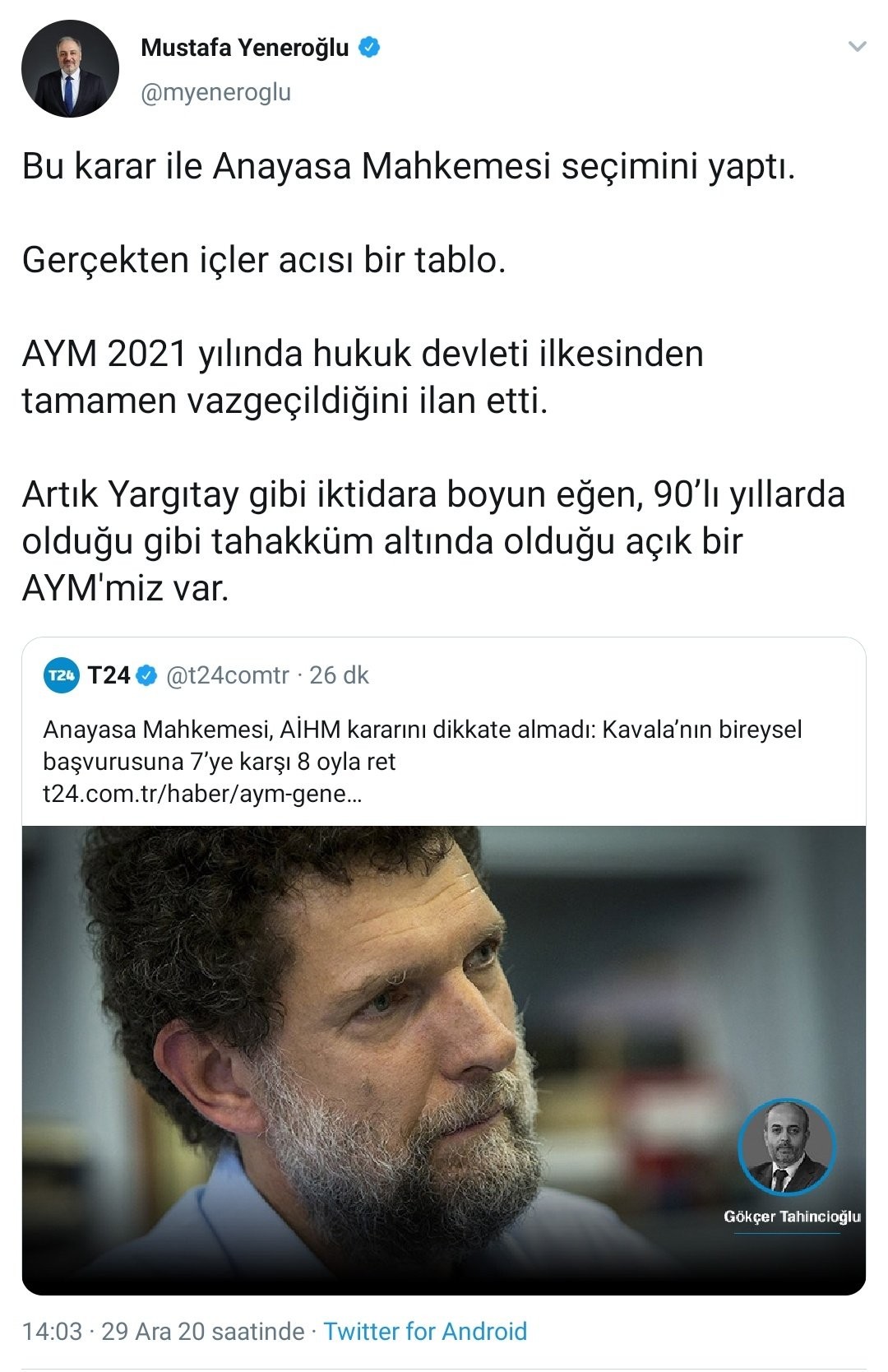 AYM’nin Enis Berberoğlu kararında övgüler dizen Yeneroğlu, Osman Kavala kararında ise, AYM'nin iktidara boyun eğdiğini söyleyerek, “Bu karar ile Anayasa Mahkemesi seçimini yaptı. Gerçekten içler acısı bir tablo. AYM 2021 yılında hukuk devleti ilkesinden tamamen vazgeçildiğini ilan etti. Artık Yargıtay gibi iktidara boyun eğen, 90’lı yıllarda olduğu gibi tahakküm altında olduğu açık bir AYM'miz var.” açıklamasında bulundu.