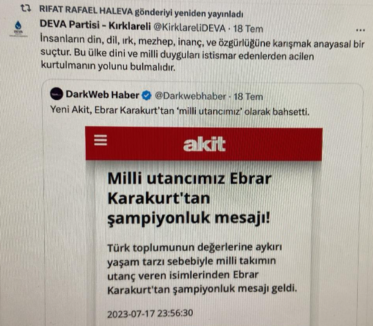 Öte yandan DEVA'lı yahudi adayın, bir başka sosyal medya paylaşımında da eşcinsel sapkın Ebrar Karakurt üzerinden milli değerlere savaş açtığı görüldü.
