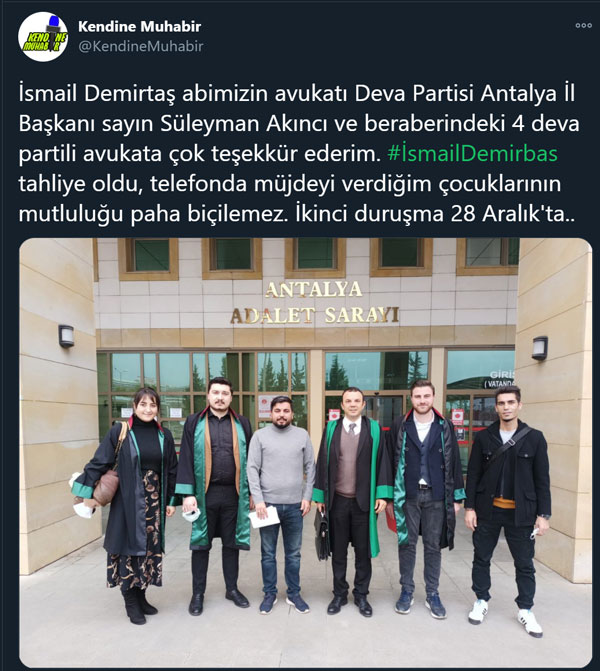 Cumhurbaşkanı Erdoğan'a hakaret ederek haddini aşan Demirbaş'ın avukatlığını DEVA Partililerin üstlendiği ortaya çıktı. Deva Partisi Antalya İl Başkanı Süleyman Akıncı ve beraberindeki 4 DEVA Partili avukat, İsmail Demirbaş'ın avukatlığını yaptı. Demirbaş tahliye edildi.