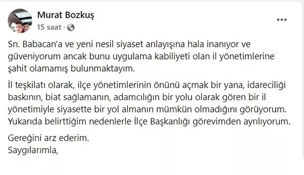 İlçe başkanlığı görevinden istifa ettiğini sosyal medya hesabından duyuran Bozkuş paylaşımında "Ali Babacan'a ve yeni nesil siyaset anlayışına hala inanıyor ve güveniyorum ancak bunu uygulama kabiliyeti olan il yönetimlerine şahit olamamış bulunmaktayım. İl teşkilatı olarak, ilçe yönetimlerinin önünü açmak bir yana, idareciliği baskının, biat sağlamanın, adamcılığın bir yolu olarak gören bir il yönetimiyle siyasette bir yol almanın mümkün olmadığını görüyorum. Yukarıda belirttiğim nedenlerle İlçe Başkanlığı görevimden ayrılıyorum. Gereğini arz ederim. Saygılarımla" ifadelerini kullandı.