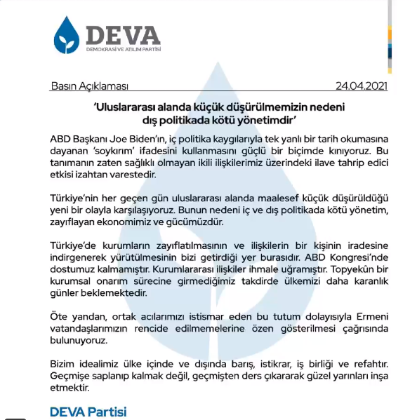DEVA Partisi’nden yapılan yazılı açıklamada, “ABD Başkanı Joe Biden’ın, iç politika kaygılarıyla tek yanlı bir tarih okumasına dayanan ‘soykırım’ ifadesini kullanmasını güçlü bir biçimde kınıyoruz. Bu tanımanın zaten sağlıklı olmayan ikili ilişkilerimiz üzerindeki ilave tahrip edici etkisi izahtan varestedir” denildi.