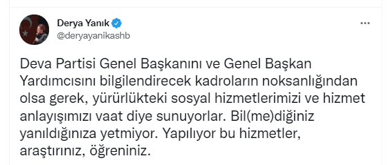 Bakan Yanık, "Deva Partisi Genel Başkanını ve Genel Başkan Yardımcısını bilgilendirecek kadroların noksanlığından olsa gerek, yürürlükteki sosyal hizmetlerimizi ve hizmet anlayışımızı vaat diye sunuyorlar. Bil(me)diğiniz yanıldığınıza yetmiyor. Yapılıyor bu hizmetler, araştırınız, öğreniniz." ifadelerini kullandı.