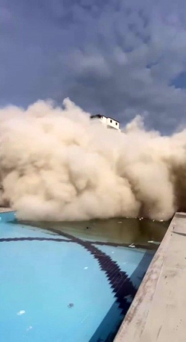 Devasa binanın kontrollü olarak yıkıldığı anlar cep telefonu kamerasıyla saniye saniye görüntülendi.